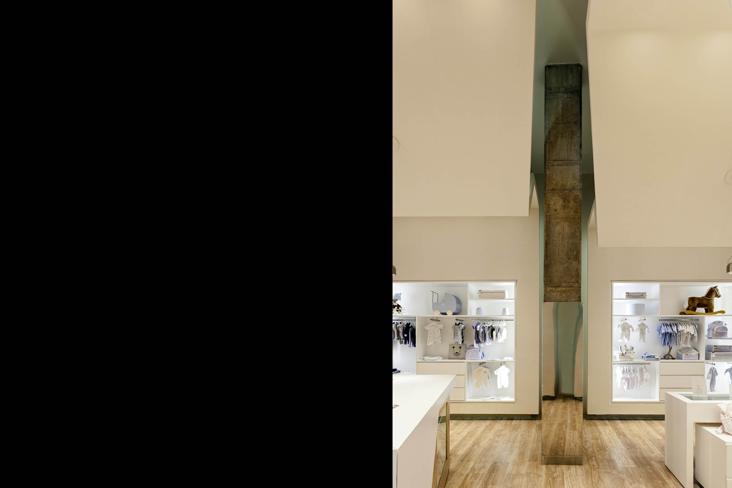 Como estrategia, se reinterpretan las columnas a modo de grilla, dividiendo longitudinalmente el local en 2 grandes áreas: circulación y contacto con los productos. Transversalmente, se genera un gran espacio continuo, ordenado a partir de la introducción de un sistema de 'cintas plegadas' que dividen el espacio en cinco sectores: el ingreso y la vidriera, los tres sectores centrales para exhibición y venta de los productos (acomodando los elementos y la ropa por franja etaria, desde bebes a niños de 6 años), y el depósito con un espacio de oficina.