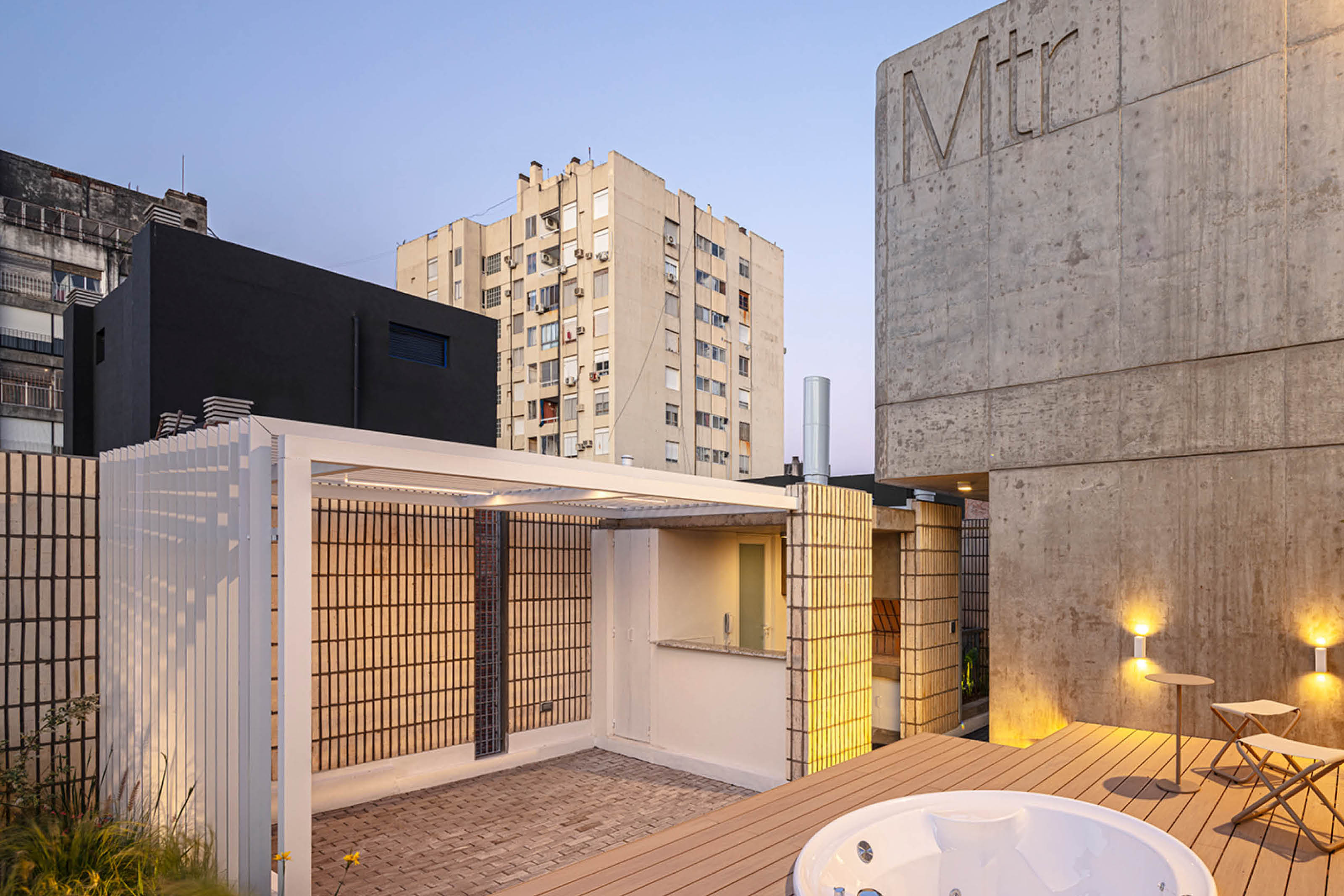 La estrategia del proyecto busca revalorizar y reinterpretar el edificio lindero, La Mercantil, de Newton, Larguia y De la torre, del año 1950. A partir de esto, se crea un lenguaje contemporáneo acentuando la verticalidad que encontramos en los parasoles metálicos de La Mercantil. De esta manera se produce una doble piel exterior que define la imagen urbana del edificio y funciona tanto para frenar la incidencia de la luz solar Este/Oeste, como así también, se constituye en un dispositivo que filtre la privacidad entre el interior y el exterior (en un entorno muy denso y de alto tránsito). Para lograr la reconexión con el exterior, se realizan sustracciones en la envolvente de parasoles verticales, produciendo aperturas hacia la calle. A su vez, las alturas de los linderos definen el movimiento de la fachada, generando curvas que se van abriendo o cerrando de tal forma para lograr las mejores visuales en cada caso.