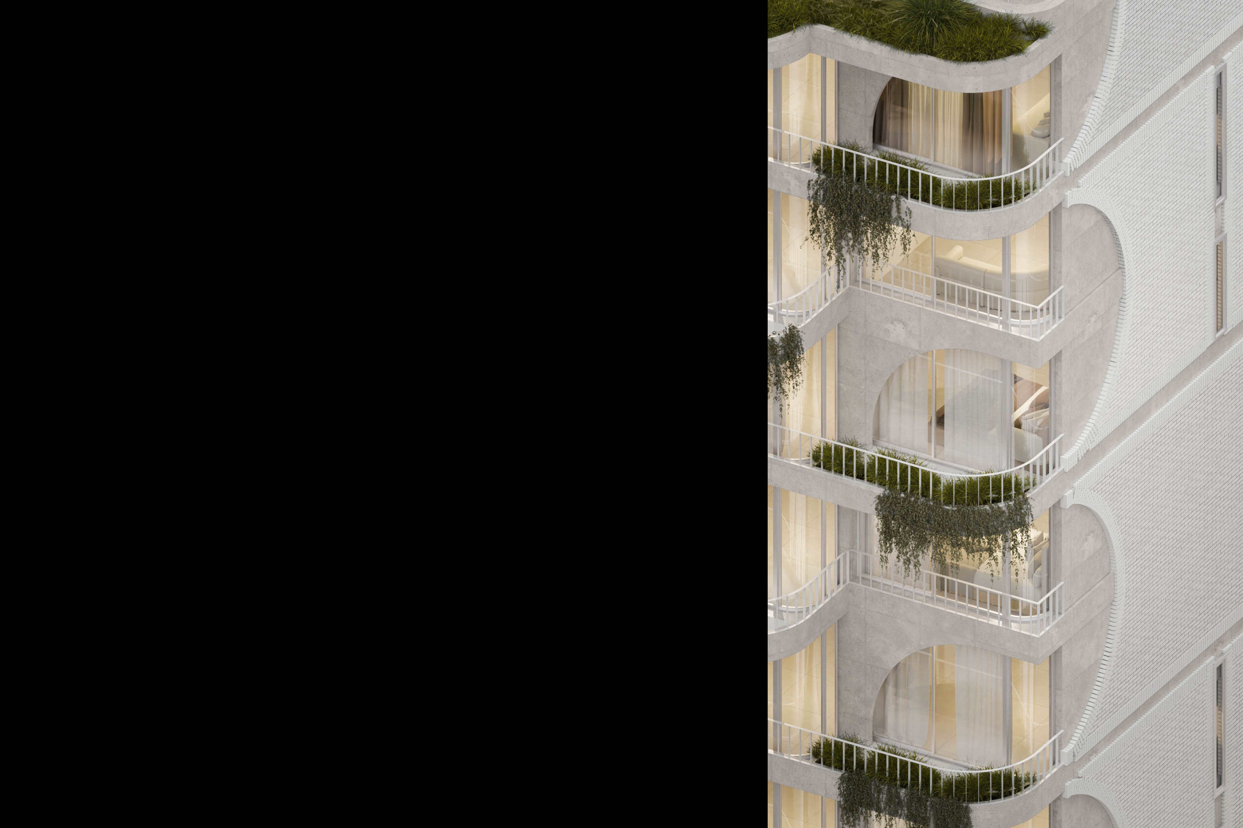 Aquí la utilización del arco adquiere un sentido arquitectónico formal, trasladando el dinamismo y la suavidad propia de su forma geométrica no solo a la vista de sus fachadas y medianeras, sino también en las plantas de unidades y espacios comunes. Pero además la utilización del medio arco favorece a soportar las cargas en voladizo propias de sus balcones de gran profundidad al funcionar como una especie de ménsula, y replicando la forma del diagrama de momento flector de un voladizo.