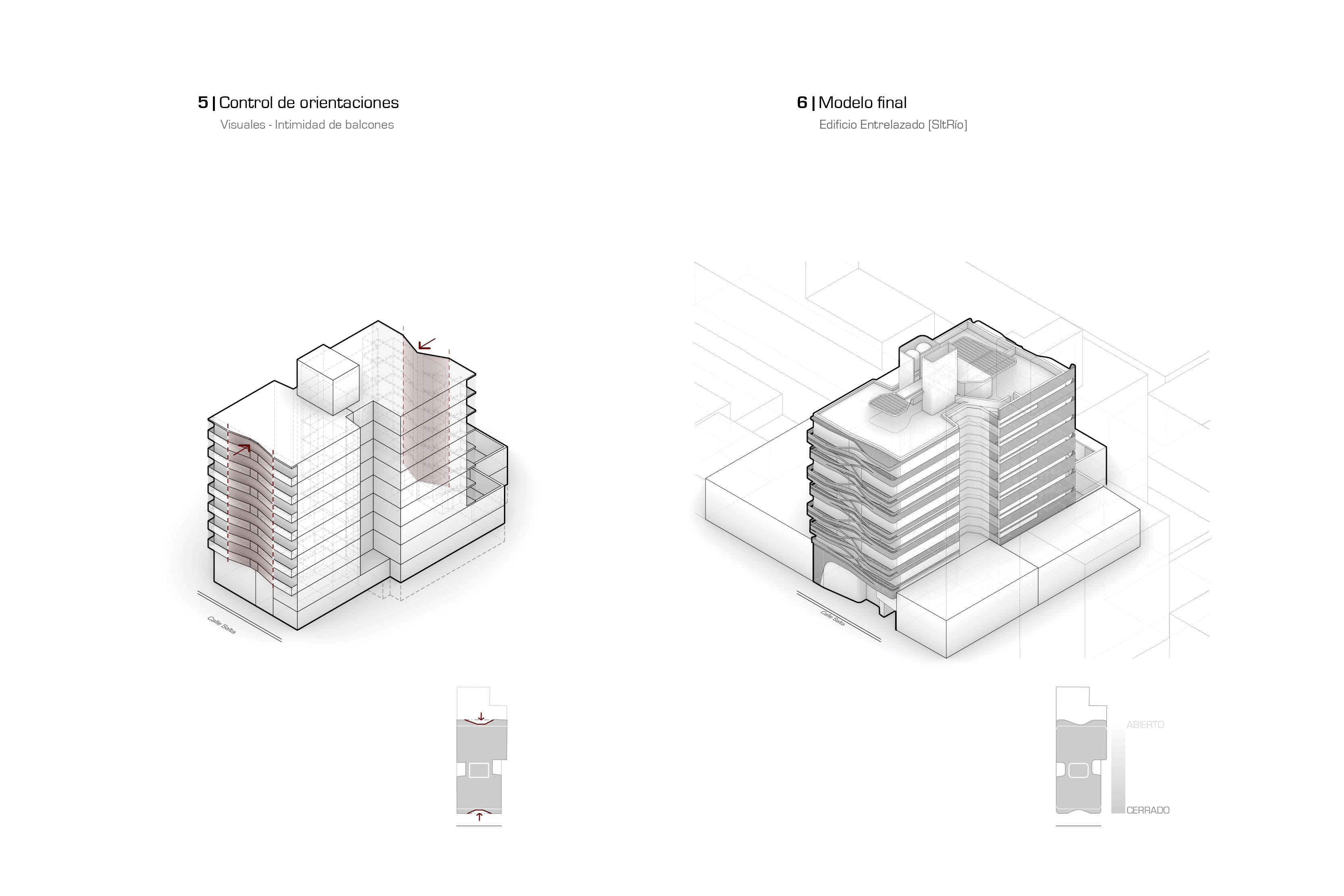 La estrategia que define la forma del edificio es un tejido entrelazado de hormigón que se cierra al sur, donde se encuentra la calle y los dormitorios, brindando intimidad al conjunto. Por el contrario, se desenlaza al norte, reafirmando la mejor orientación y las visuales al río Paraná desde los espacios sociales. El lenguaje entrelazado lo moldea todo, envolviendo la masa edilicia en su totalidad y definiendo la imagen del edificio en relación a la dinámica de la ciudad contemporánea.